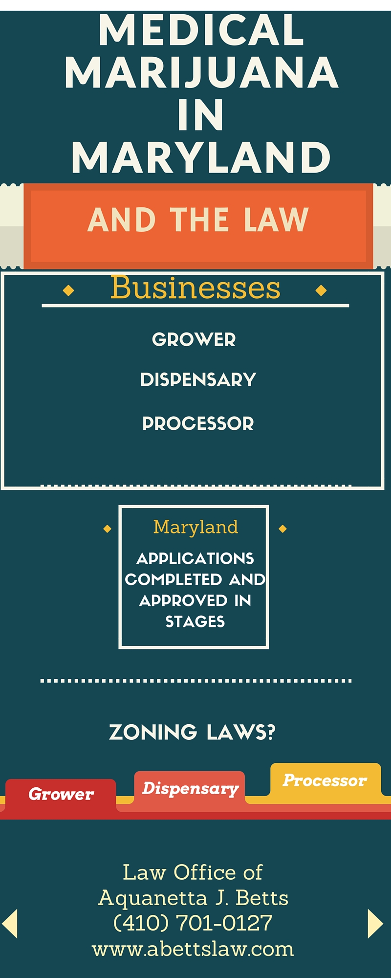 The Natalie M. LaPrade Maryland Medical Cannabis Commission develops policies, procedures and regulations to implement programs that ensure medical cannabis is available to qualifying patients in a safe and effective manner. The Commission oversees all licensing, registration, inspection and testing measures pertaining to Maryland’s medical cannabis program and provides relevant program information to patients, physicians, growers, dispensers, processors, testing laboratories and caregivers. Grower, Processor and Dispensary License Applications Have Been Posted The Natalie M. LaPrade Maryland Medical Cannabis Commission has posted applications for those seeking a license to operate as a medical cannabis grower, processor or dispenser within the state. Please note, the deadline to submit an application is November 6, 2015. Each application form includes comprehensive instructions and a detailed description of the scoring process the Commission and its agents will utilize in evaluating each application. For more information visit: http://mmcc.maryland.gov/pages/applications/applications.aspx The information above is posted for informational purposes only and not to provide legal advice. Contact the Law Office of Aquanetta J. Betts to help your business navigate the new Medical Marijuana laws in Maryland. Call (410) 701-0127 or visit our website www.abettslaw.com. |